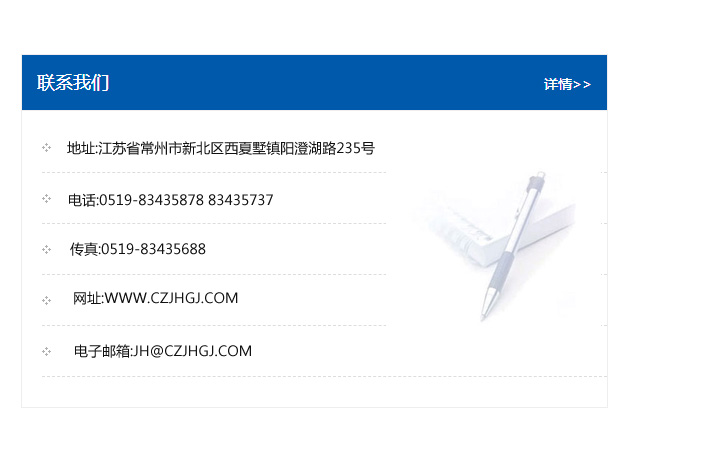 地址:常州市新北區友邦商務大廈1幢16、17層  電話:0519-85101652  傳真:0519-85112595  郵編:213022  網址:www.cz-jiayue_cn.lyghrcj.com  郵箱:xiajifengaa@163.com